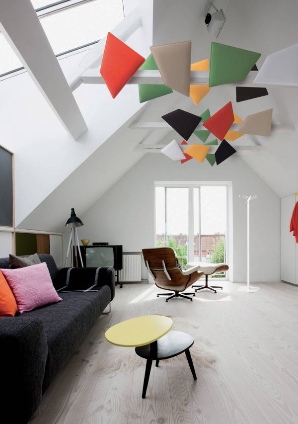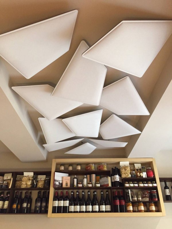 Featuring an articulated spherical hinge, these strong acoustic panels can be attached to floors or ceilings and adjusted to adapt aesthetics and acoustic performance as needed